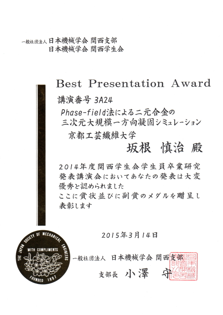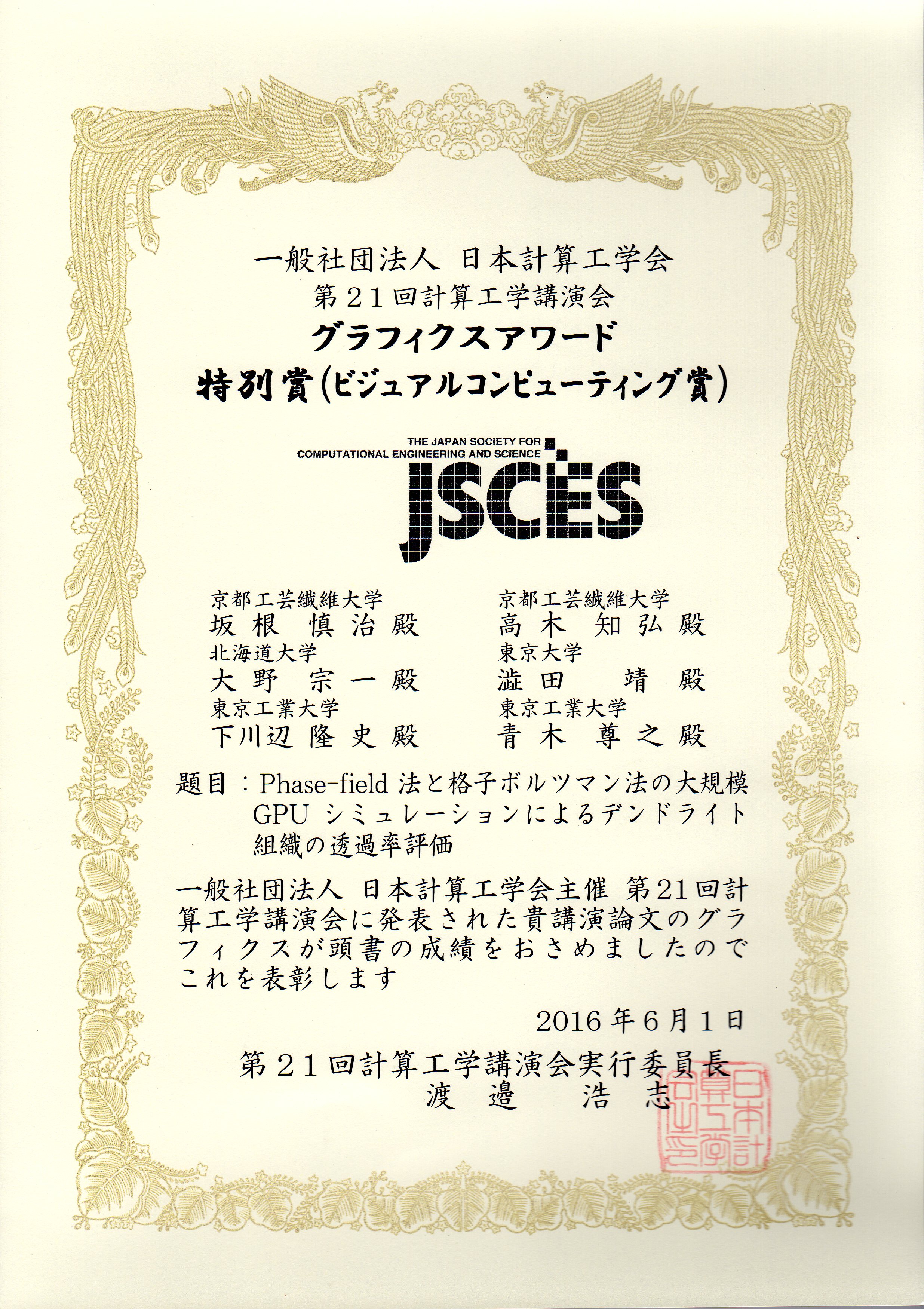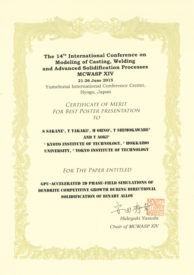 2015年6月24日 S. Sakane, T. Takaki, M. Ohno, T. Shimokawabe, T. Aoki [賞状]