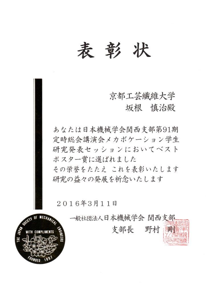 日本機械学会関西支部第91期定時総会講演会メカボケーション学生研究発表ベストポスター賞