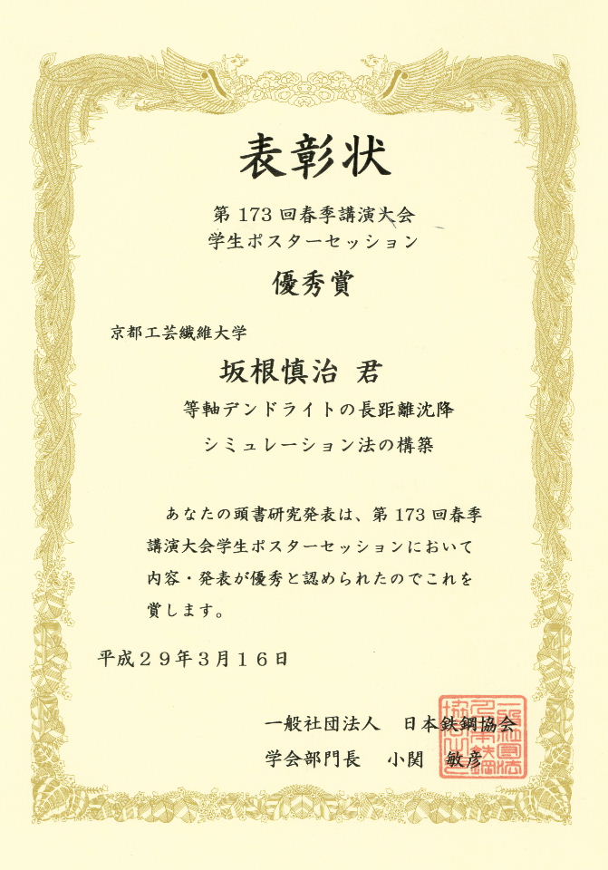 日本鉄鋼協会第173回春季講演大会学生ポスターセッション優秀賞