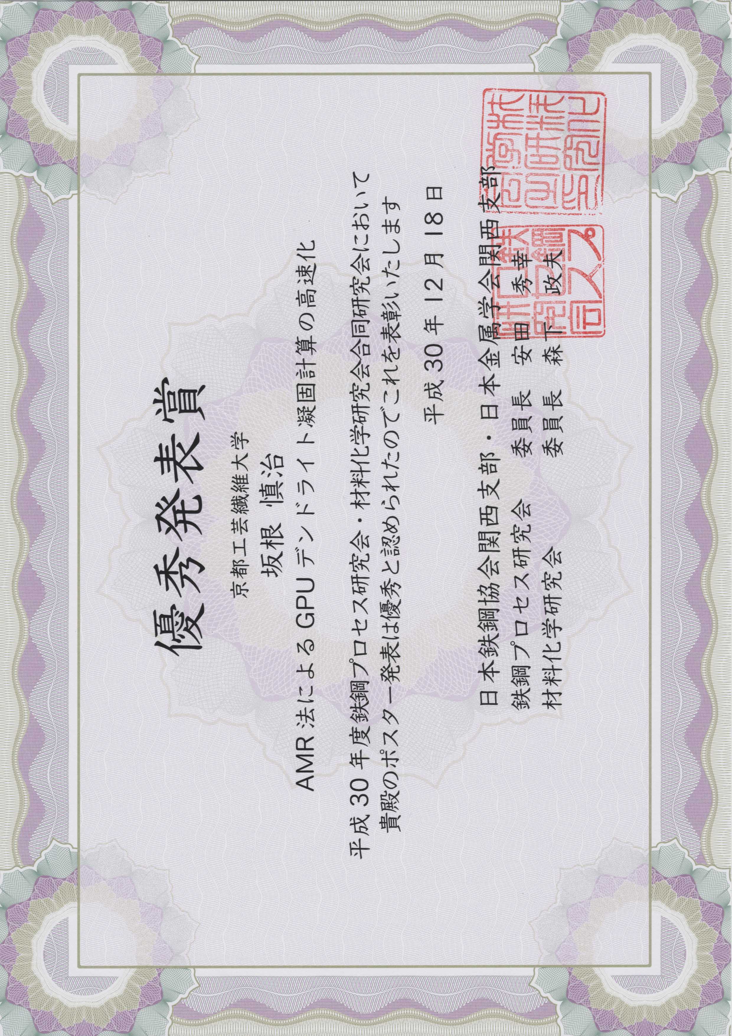 日本鉄鋼協会・日本金属学会関西支部 平成30年度鉄鋼プロセス研究会・材料化学研究会合同研究会 優秀発表賞